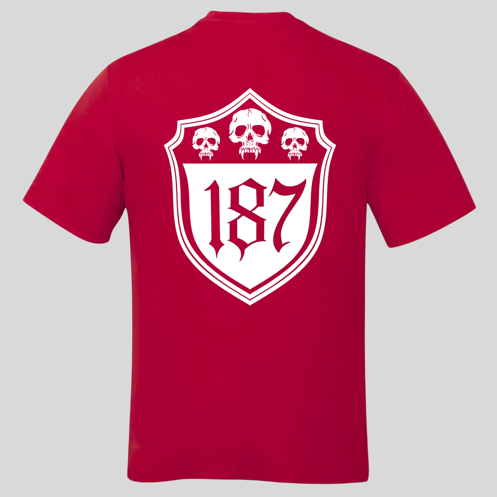 T-shirt rouge premium fabriqué avec des matériaux de qualité, avec le logo Die-On à l’avant et le logo 187 imprimé en grand au dos.